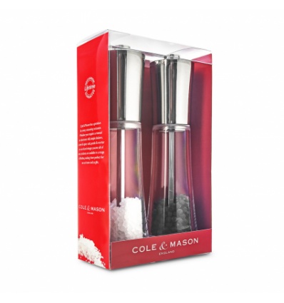 • Височина: 16.5 см.• Материал: акрил, стомана, керамика• Цвят: хром• Механизъм на мелницата за сол: керамичен• Механизъм на мелницата за черен пипер: закалена въглеродна стомана• Да не се мокри с вода!• Не използвайте мелничките за различни от каменна сол и черен пипер продукти!!! Производител: Cole&Mason / Англия
