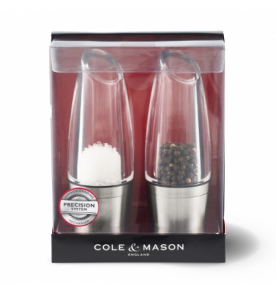 Като част от гамата мелници на Cole & Mason, тези мелнички са проектиран за лесно използване, изработени с високо качество и красив дизайн. Прецизните механизми (керамичен на мелничката за сол и закалена въглеродна стомана на мелничката за пипер) гарантират лесно и равномерно смилане на подправките.