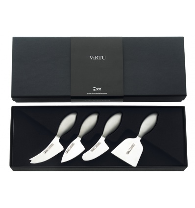 IVO Cutelarias Сет ножове за сирена "VIRTU"• Серия "VIRTU"• Комплектът включва: – Кръгъл нож - 70 мм– Нож за сирене - 60 мм– Нож за твърди сирена - 70 мм– Нож за меки сирена - 90 мм• Марка стомана:  X50 Cr Mo V14• Заточване: двустранно симетрично• Материал дръжка: неръждаема стомана AISI 304Производител: IVO Cutelarias / Португалия!!! Внимание: Пазете от деца