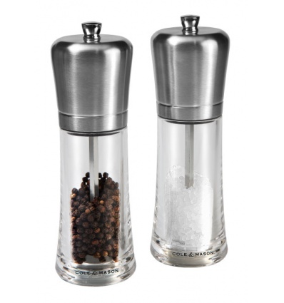 • Височина: 18 см.• Материал: акрил, стомана, керамика• Цвят: прозрачен• Механизъм: закалена въглеродна стомана; керамичен механизъм• Регулируеми настройки на мелене: от едро до фино• Пълни (със сол и черен пипер)• Да не се мокрят с вода!• Не използвайте мелничките за различни от сол и черен пипер продукти!!! • Производител: Cole&Mason / Англия