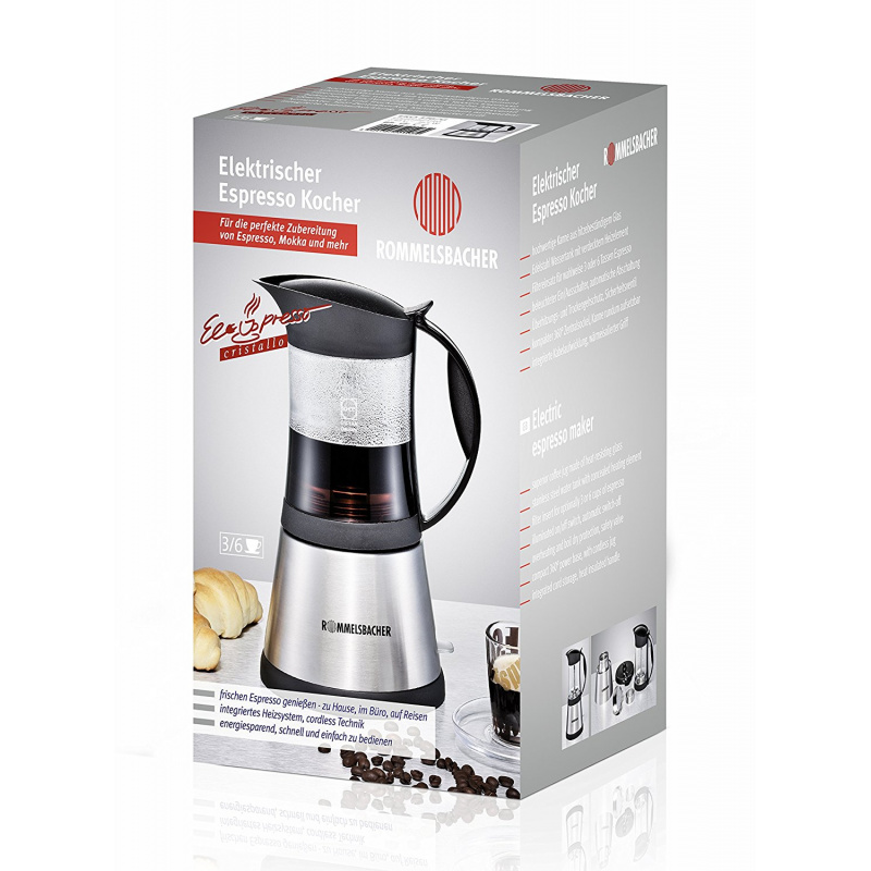 С електрическата кафеварка ROMMELSBACHER RO EKO 376/G ще приготвяте любимата си тонизираща напитка бързо и лесно. Кафеварката е изработена от висококачествена неръждаема стомана и топлоустойчиво стъкло, има мощност 365 W и вместимост 350 ml. ROMMELSBACHER RO EKO EKO 376/G разполага с основа с безопасен електрически нагревателен елемент, ключ за включване и изключване, предпазен клапан, функция за автоматично изключване и топлоизолирана дръжка с удобен захват. Безжичната технология на уреда ви позволява да движите кафеварката на 360°, което я прави удобна за употреба от хора боравещи с лява или дясна ръка. С електрическата кафеварка ще приготвяте от 3 до 6 чаши ароматно еспресо кафе за вас и любимите ви хора.