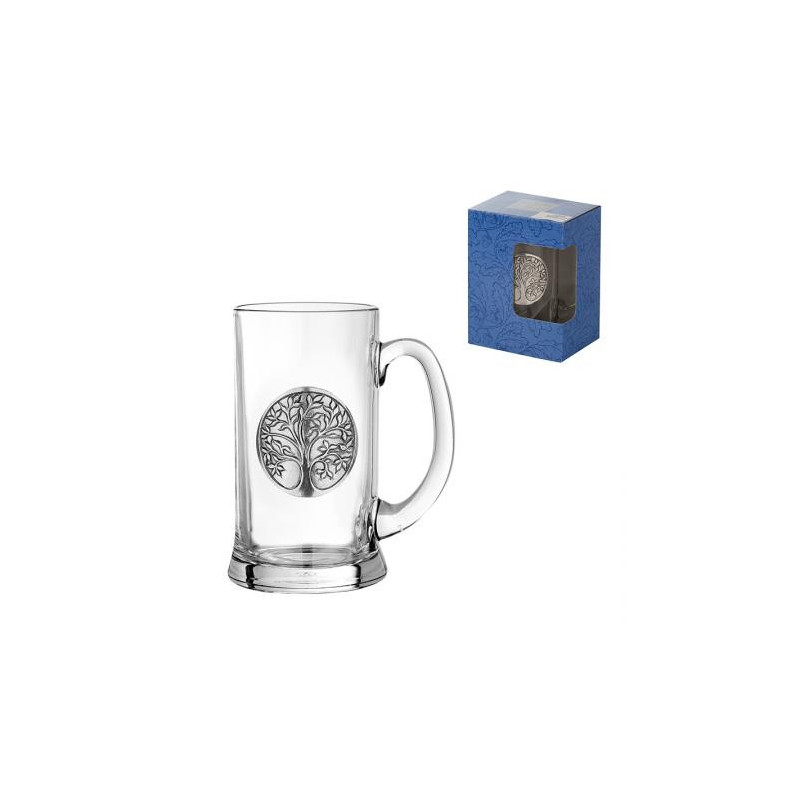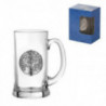 Оригинална халба за бира от стъкло с удобна дръжка. Умела метална гравюра, изработена от калай и сребро. Произведена в Австрия. Размери: Ø 8 см, височина - 15 см , вместимост - 500 мл.