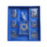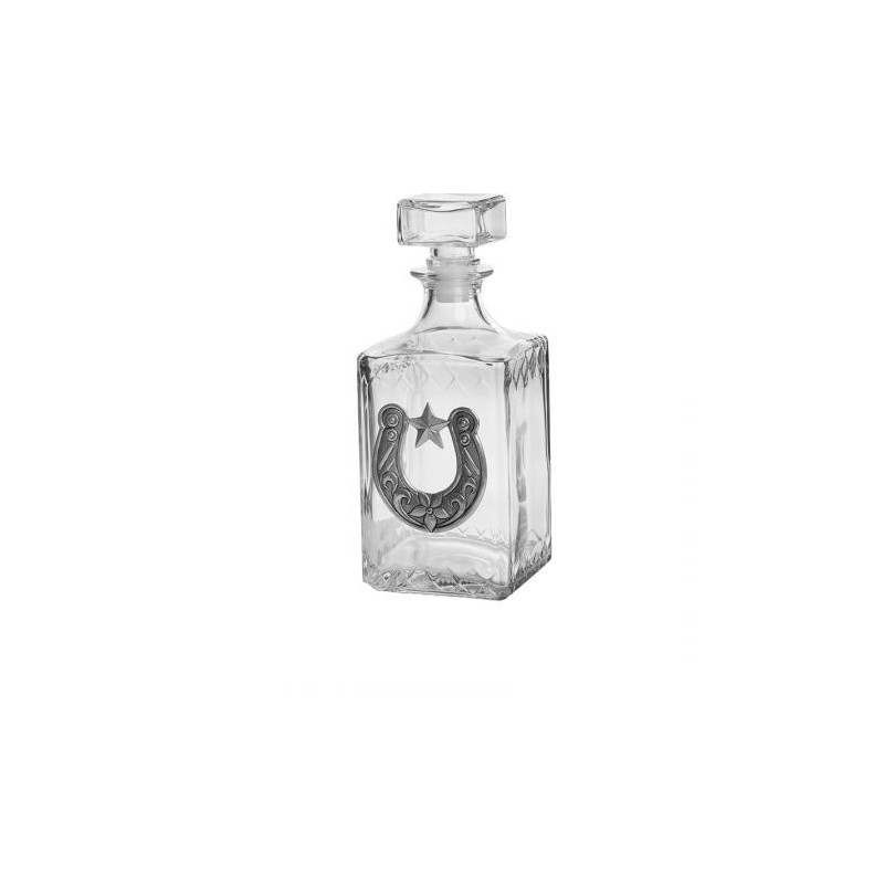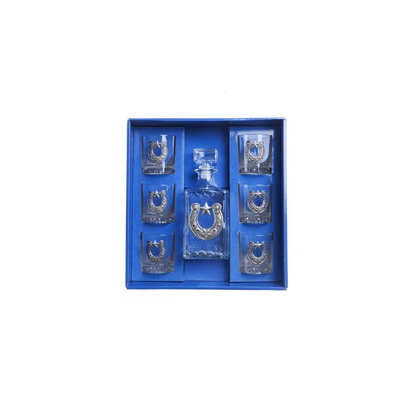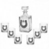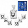 Сет за алкохол от стъкло, издържан в класически стил, състоящ се от 6 бр. чаши и четвъртита бутилка с масивна стъклена запушалка. Този строг дизайн завършва визията си с изящно инкрустиран метален грозд с листа от калай и сребро и гравюра с изображение , което го превръща в луксозно празнично предложение, обогатяващ етикета на сервиране на качествени напитки. Произведен от Artina, Австрия. Височина бутилка 24 см, височина чаши 8,5 см. Вместимост на чашите 200 мл. , вместимост на бутилката 1000 мл.