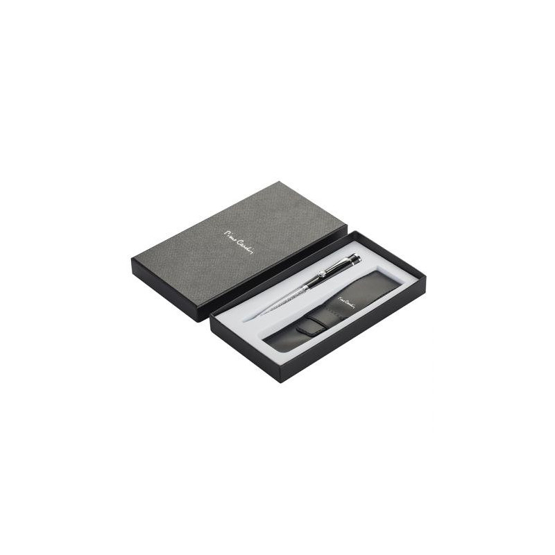 Химикал в подаръчна кутия Pierre Cardin. В комплекта се включва калъфче за химикала. Материал: метал черено и сребърно покритие; Свароски кристали. Доставя се със син пълнител.