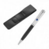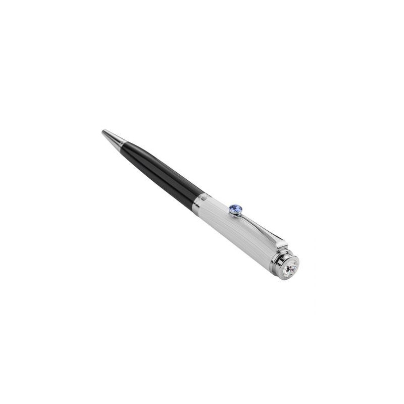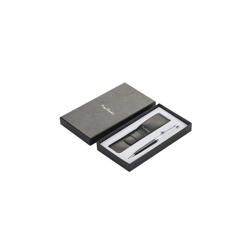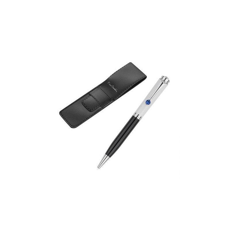Химикал в подаръчна кутия Pierre Cardin. В комплекта се включва калъфче за химикала. Материал: метал черно - бяло покритие; Свароски кристали. Доставя се със син пълнител.
