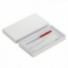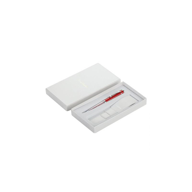 Химикал в подаръчна кутия Pierre Cardin. В комплекта се включва калъфче за химикала. Материал: метал червено и сребърно покритие; Свароски кристали. Доставя се със син пълнител.