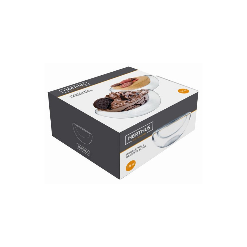 Двустенна стъклена купа на Nerthus, изработена от топлоустойчиво боросиликатно стъкло, подходяща за топли и студени десерти, ядки, лед и др. Без значение какво ще предложите на гостите си, температурата на външната стена на купата остава постоянна, благодарение на изолационния ефект на въздуха между двата стъклени слоя.