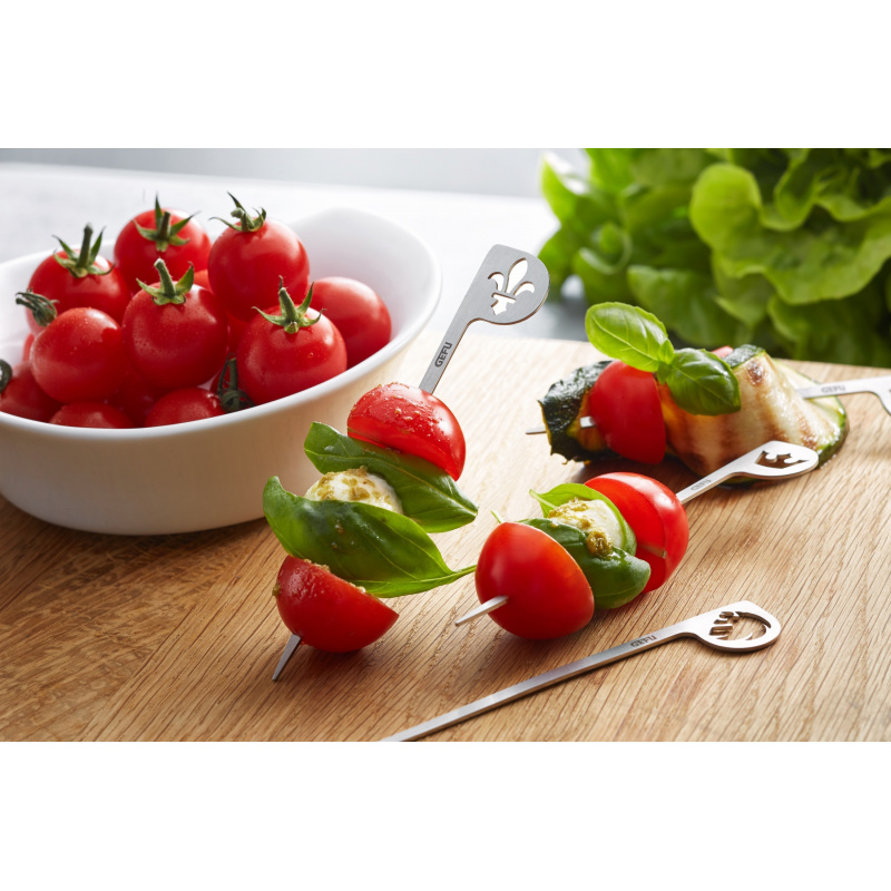 GEFU Комплект от 6 бр. парти шишчета“GALA“ • Материал: висококачествена неръждаема стомана  • Размери: 12 х 2 х 0,1 см • Подходящо за хамбургери, хапки, плодови шишчета, коктейли• Можете да миете в съдомиялна машина• Украса на дръжката: 6 различни мотиваПроизводител: GEFU / Германия