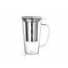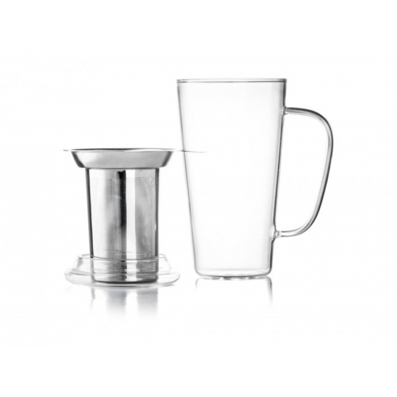 Чаена чаша от боросиликатно стъкло с голям филтър за чай от неръждаема стомана. Стъкленият капак може да служи и като поставка за филтъра.