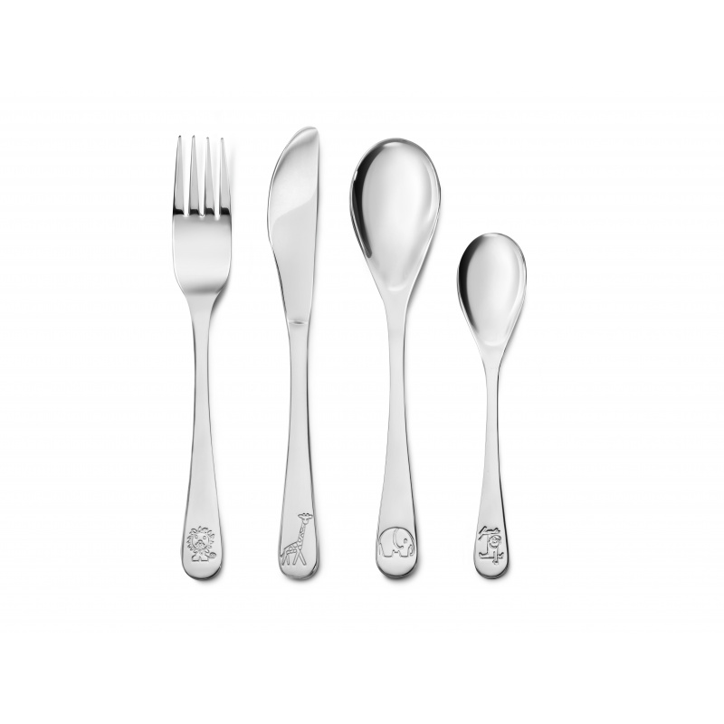 ZILVERSTAD Комплект детски прибори за хранене “Зоопарк“ • Комплект от 4 части• Размери: 16 / 17 / 16 /13 см • С декорация в края на дръжката - слон, маймуна, жираф и лъв• Предлага се в красива цветна кутия• Материал: неръждаема стомана 18/10• Тегло: 0,130 кг • Подходящи за миене в съдомиялна машина• Бранд: ZILVERSTAD Производител: Bredermaijer Group / Нидерландия