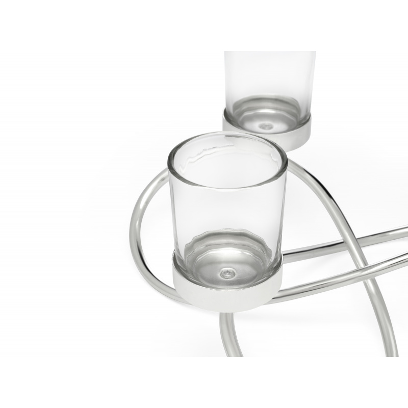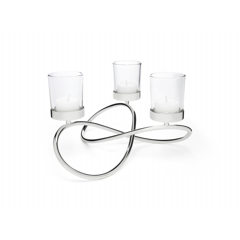 Този посребен свещник е за 3 чаени свещи. Знакът за безкрайност, изработен в дизайна, е символ на вечността и безкрайността. Свещникът е лакиран, не потъмнява и не се изисква полиране.