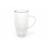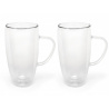 Тези красиви чаши за капучино или лате макиато са направени от боросиликатно стъкло, което има по-дълъг живот от повечето видове стъкло. Благодарение на двойните стени  на чашите, горещите напитки запазват температурата си за по-дълго, а студените напитки не образуват конденз. Чашите са с вместимост 400 мл. и са подходящи за микровълнова фурна и съдомиялна машина. Разполагаме с богата гама двустенни чаши, които са подходящи за чай, кафе, еспресо, капучино, лате макиато, но също така и безалкохолни напитки и лимонада.