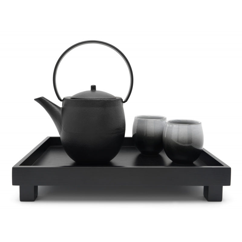 С този сервиз за чай, вдъхновен от японската култура, можете да проведете собствена чаена церемония у дома. Представете си в азиатска обстановка с чугунен чайник и две порцеланови чаши. Чайникът е снабден с филтър от неръждаема стомана за насипен чай и има обем 1,2 литра.