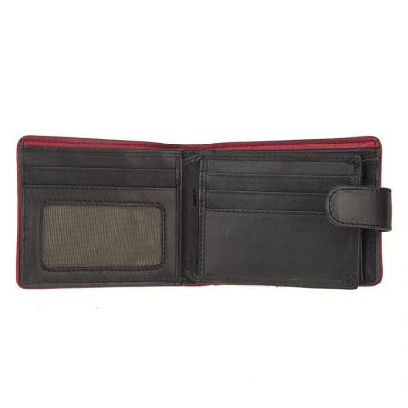 Мъжки портфейл от естествена кожа с две отделения за банкноти. Едно средно отделение за карти и лични документи. Закопчаване от лицевата страна на портфейла. Размери: 9 * 11.5 * 2 см