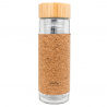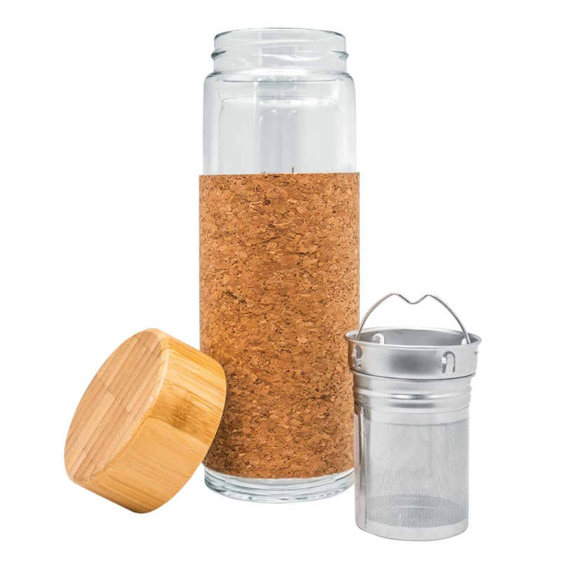 Топлоустойчива двустенна стъклена бутилка за чай, с инфузер, филтър и корков протектор, проектирана да поддържа с часове температурата на любимата Ви ароматна напитка, без значение дали я обичате гореща или студена.