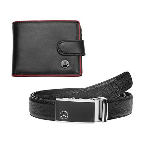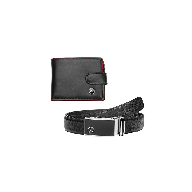 Луксозен сет от естествена кожа с лого на Mercedes. Размер на портфейла: 9 * 11.5 * 2 см. Размер на колана 110 см.