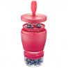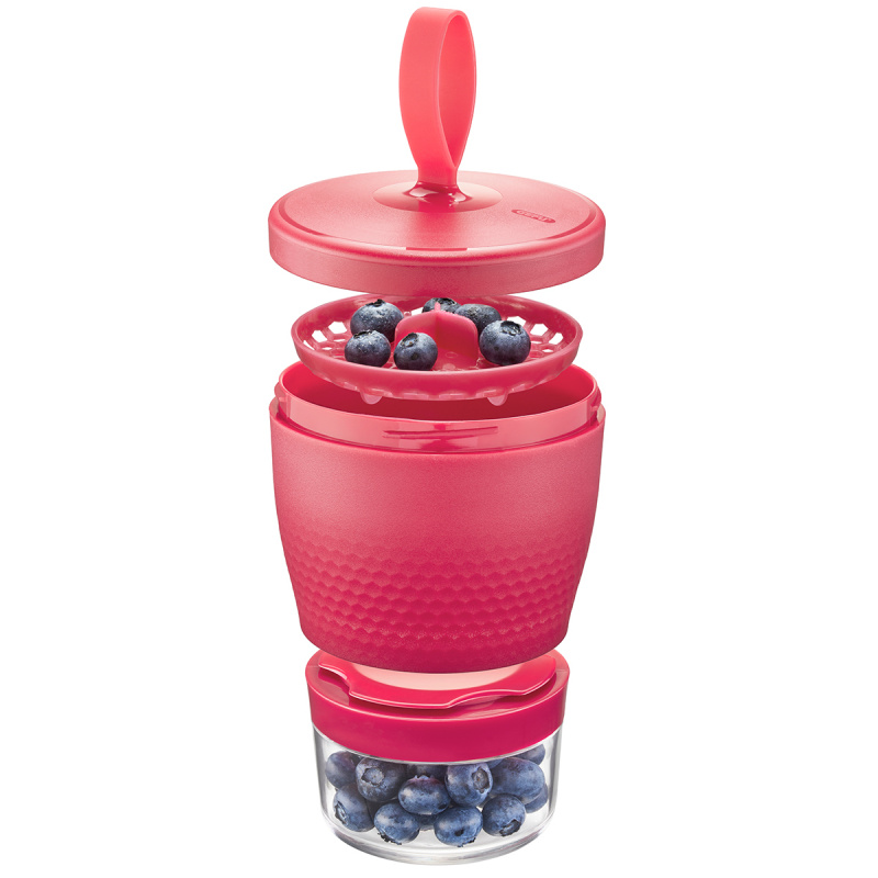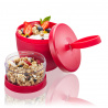 GEFU Двойна кутия за закуски "FOODIE" • Голям контейнер: 570 мл. (с тавичка за отцеждане на измити плодове) • Малък контейнер: 185 мл. • Цвят: малинено червен• Удобна и практична каишка за лесно пренасяне • Силиконово уплътнение за 100% защита от протичане • Размери: Ø 11,5 см. 23 см. (h) • Материал: Пластмаса, силикон • Подходящо за почистване в съдомиялна машина Производител: GEFU / Германия