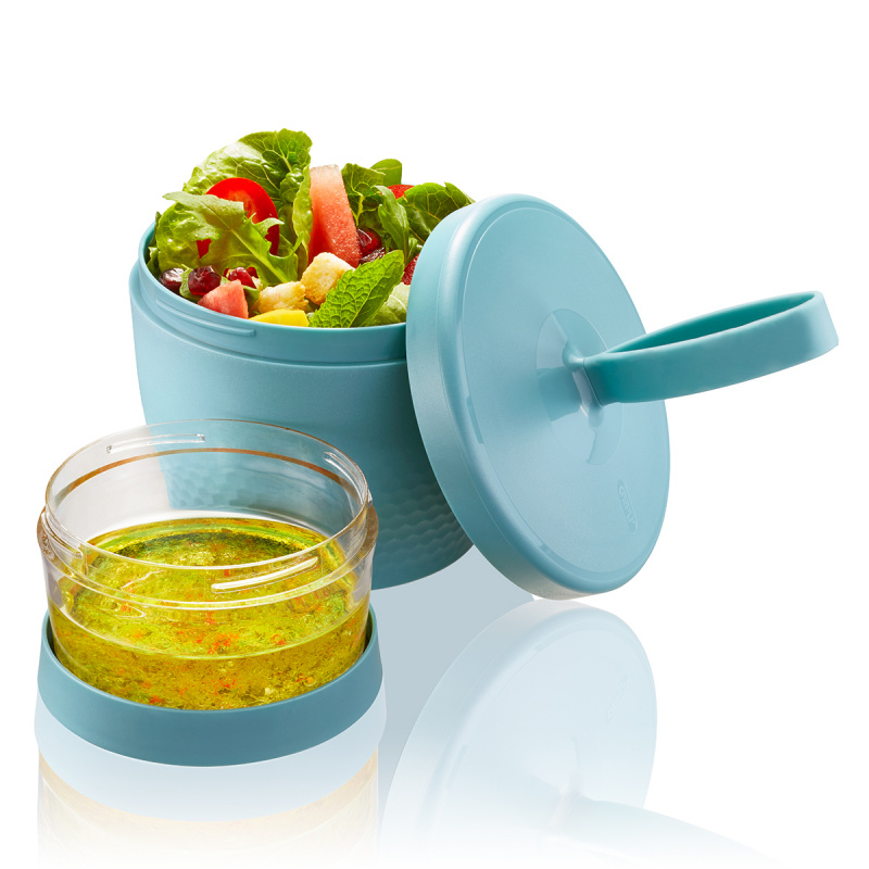 Практична и лесна за пренасяне, благодарение на вградената в капака каишка, двойна кутия за закуски. В двата различни по големина контейнера можете да пренасяте най-разнообразни комбинации от храни, сосове, десерти, плодове и др. Можете да комбинирате пресни плодове и кисело мляко, салати и дресинг, мюсли, разядки и дипове и много др