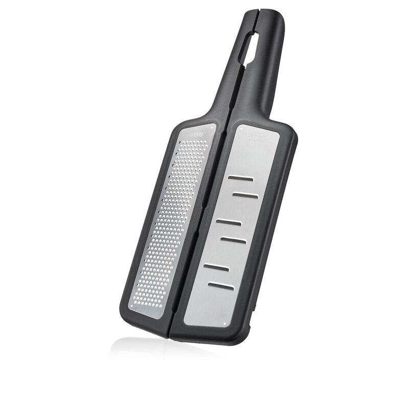 GEFU Сгъваемо двойно ренде “RAFINO“• Ергономична дръжка • Фино ренде за пармезан, подправки, джинджифил и др. • Със страна за твърди сирена, шоколад, трюфел и др. • Заточено с "DIAMOND LASER CUT" технология • С противоплъзгащи крачета • Можете да ползвате сгънато или разгънато • С халка за окачване • С предпазна капачка за остриетата • Размери: 29,5 х 11 х 2,5 см • Материал: неръждаема стомана, пластмаса • Подходящo за почистване в съдомиялна машина Производител: GEFU / Германия