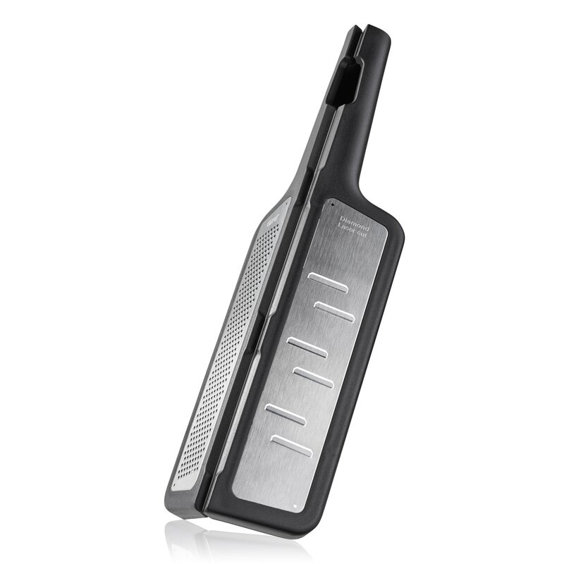 С удобна и ергономична дръжка, това ренде прави приготвянето на храна истинско удоволствие.Можете да го използвате сгънато, за по-добър захват и за да можете да се възползвате от противоплъзгащата част в края на рендето. Можете да го използвате и разгънато, като това Ви помага да рендосвате поставяйки го върху купа или съд за готвене. Изработено е от висококачествените неръждаема стомана и пластмаса. Остриетата са заточени с технология “DIAMOND LASER CUT“, което ги прави изключително остри и надеждни. Рендето включва пръстен за закачване и протектор за остриетата. Подходящо е за почистване в съдомиялна машина.