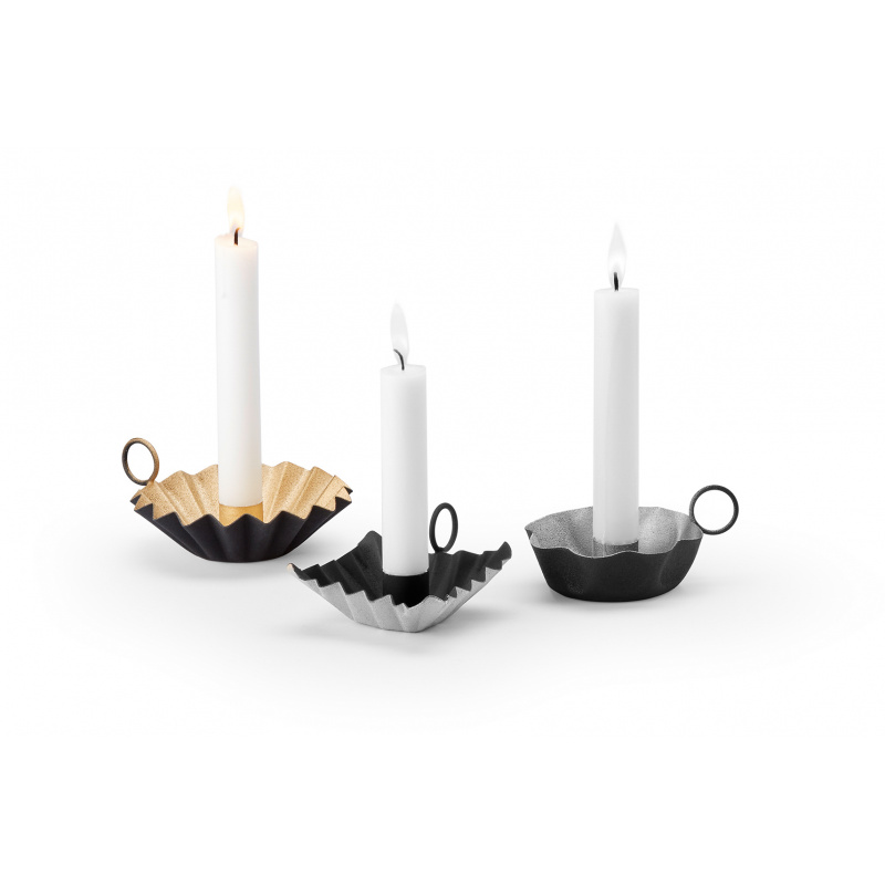 PHILIPPI Свещник “OMAMA“• Материал: прахово боядисана стомана• Размери: 14 х 12 х 6 см (ДхШхВ)• Форма: кръгла, плисе• Цвят: черно и златно• Тегло: 135 гр Производител: PHILIPPI / Германия