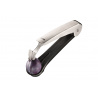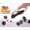 Просто поставете сливата изправена във фунията на кухненския помощник и натиснете ергономично оформената дръжка - острото кръстосано острие прави останалото! След почистване в съдомиялна машина, дръжката се заключва и DROPIO може безопасно да се прибере в чекмеджето.