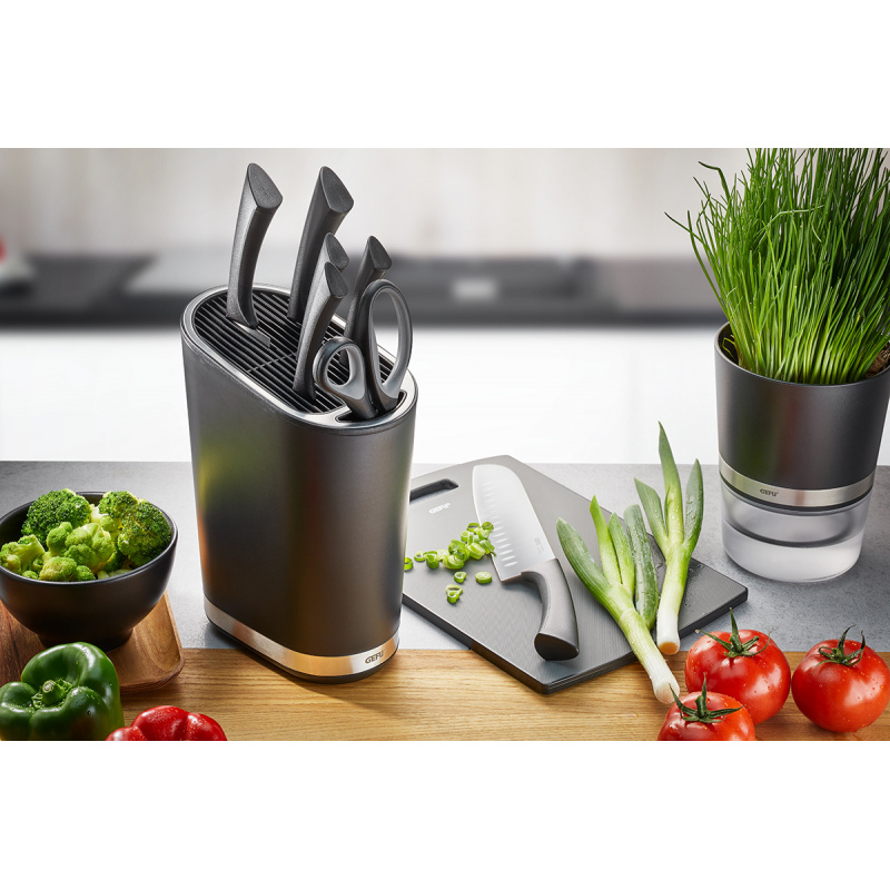 GEFU Блок за ножове “SMARTLINE“• Материал: висококачествена неръждаема стомана, пластмаса• 28 отделения за ножове с различни размери• 1 отделение за ножици или точило• Размери: 19 х 11 х 25,5 см (ДхШхВ)Производител: GEFU / Германия