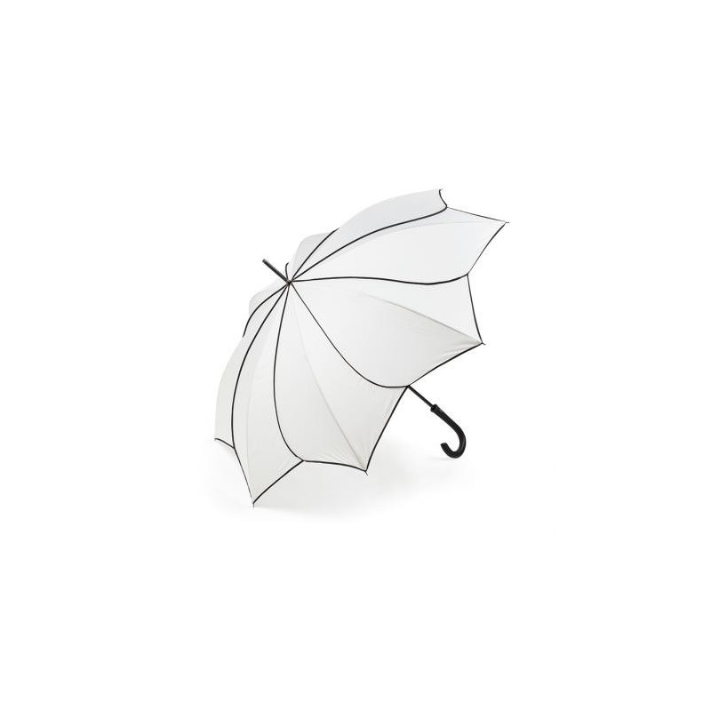 Елегантен чадър в нежно бяло с форма, наподобяваща цвете . Чадърът е с автоматично отваряне и затваряне, удобна дръжка и калъф при сгънато положение. Може да бъде вашият елегантен аксесоар - лек, удобен и подходящ за всяка дамска чанта, който да ви предпази от настроението на времето. Височина: 28 см. Диаметър: 86 см.