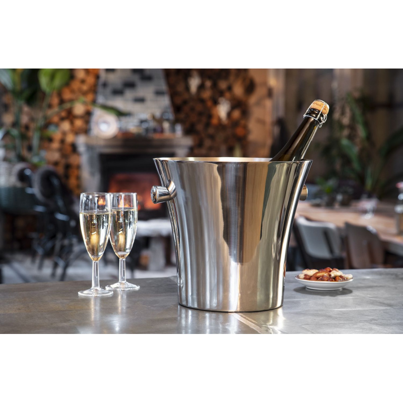 Имате ли какво да празнувате? Направете го с този охладител за шампанско от неръждаема стомана. Дръжките отстрани улесняват придвижването.