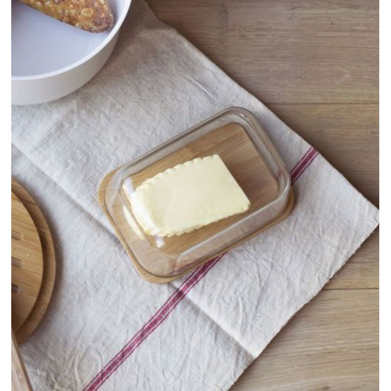 PEBBLY Кутия за масло със стъклен капак и нож• Материал: бамбук, стъкло, стомана• Цвят: естествен бамбук• Размер: 13,5 х 9,5 х 6,5 см.• Не е подходящa за съдомиялна машинаПроизводител: PEBBLY / Франция