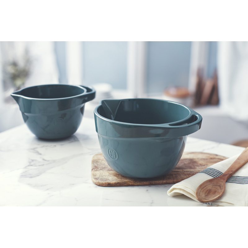 EMILE HENRY Керамична купа за миксиране и разбиване "MIXING BOWL" • Ръчно изработена от 100% естествени материали• Устойчива на температури: - 20º С до + 270º С• Равномерно разпределение на топлината• Задържа топлината на ястието по-дълго от обикновените съдове• Висока устойчивост на надраскване • Материал:  HR® Ceramic (High Resistance) / Високо устойчива керамика / • Без съдържание на олово, кадмий и никел• Външен размер вкл.дръжките: 27 х 22 х 14,5 см• Вътрешен размер: 20 х 20 х 13,5 см• Вместимост: 3,5 литра• Тегло: 1,8 кг• Цвят: синьо-зелен• Подходяща за: фурна / микровълнова фурна / фризер / съдомиялна машинаПроизводител: EMILE HENRY / Франция