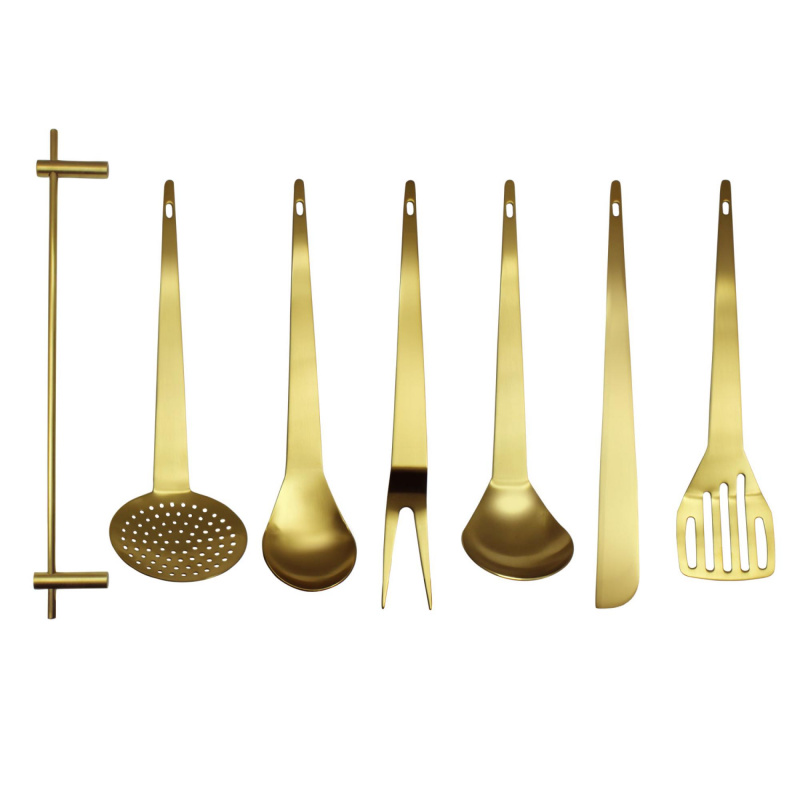 HERDMAR Комплект прибори за сервиране “INGA“ - 7 части - старо злато• Изработени от неръждаема стомана 18/10• PVD покритие - старо злато, мат• Подходящи за почистване в съдомиялна машина. Комплектът включва:• Вилица за месо: 1 бр.• Решетъчна шпатула: 1 бр.• Карвинг нож: 1 бр.• Черпак: 1 бр.• Лъжица за сервиране: 1 бр.• Решетъчна лъжица: 1 бр.• Стенна поставка + 6 бр кукиПРОИЗВОДИТЕЛ: HERDMAR / Португалия