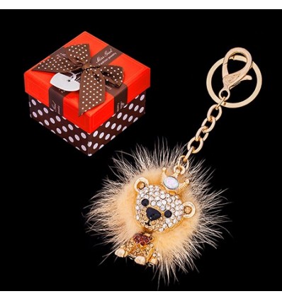 Модерен дамски ключодържател с бежов пух от естествен косъм и кристали. Подходящ аксесоар за дамска чанта и раница. Визията се допълва от малко златно лъвче, покрито с нежни кристалчета. Ключодържателят е с дължина 13,5 см. Цената включва луксозна подаръчна кутия с размери 8,8см х 8,8см, височина - 6см. Прекрасен подарък за любим човек и допълнение към деня на всяка дама.