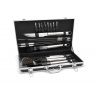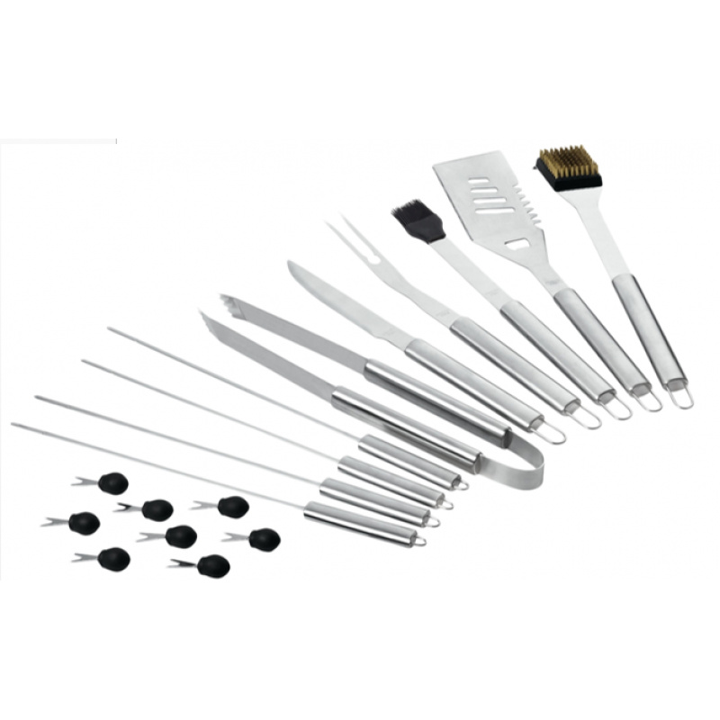 Здрав, лек калъф с инструменти за барбекю от неръждаема стомана, състоящ се от: вилица, щипки, шпатула, нож, 4 шишчета, 8 държача на царевичен кочан, четка за почистване.