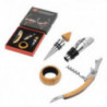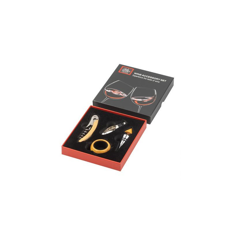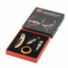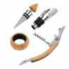 Комплект аксесоари за вино, 4 части. Комплекта съдържа тирбушон, пръстен, дозатор и тапа. Размер на кутията 17x16см.