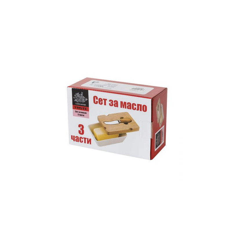 Комплект кутия за масло с нож за рязане и дъска. Размери на кутията 15,5x10,5x5см. Размер на опаковката 17x12x7см.