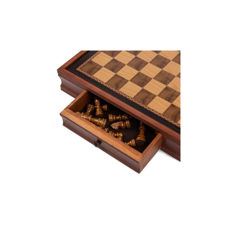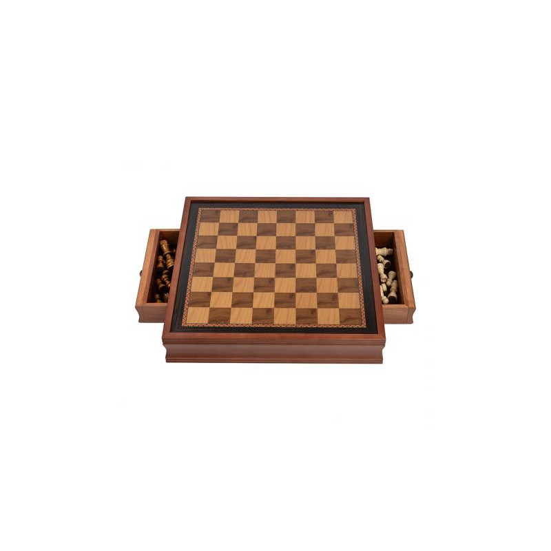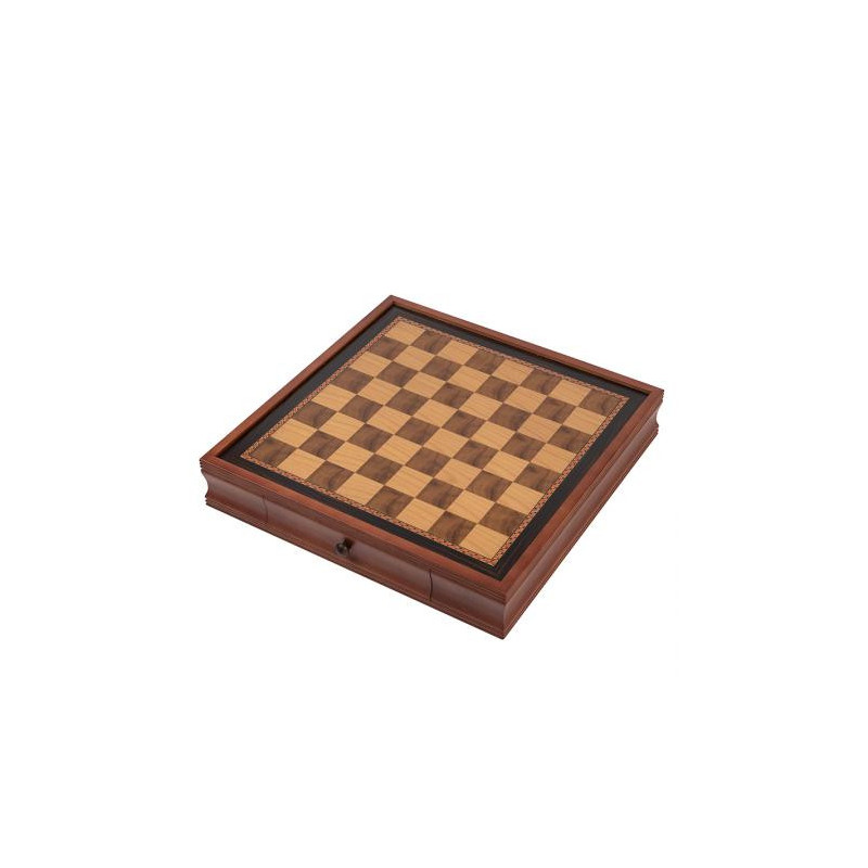 Класически шах изработен от висококачествен дървен материал и естествен фурнир. Съдържа шахматни фигури. Размери: 42/42