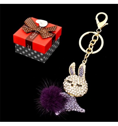 Модерен дамски ключодържател с тъмно лилав пух от естествен косъм и кристали. Подходящ аксесоар за дамска чанта и раница. Ключодържателят представлява зайче с опашка лилаво пухче, обсипано с цветни кристалчета. Ключодържателят е с дължина 15см. Цената включва луксозна подаръчна кутия с размери 8,8см. х 8,8см. , височина 6см.Прекрасен подарък за любим човек.
