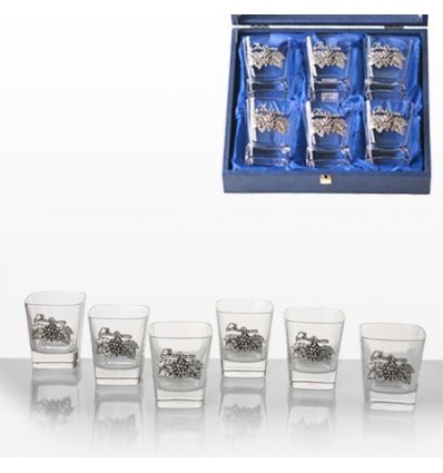 Сетът се състои от 6 бр. чаши за уиски от кристално стъкло с квадратен дизайн и високо дъно. Изящна декорация от сплав от калай и сребро във формата на детайлен грозд с листа. Произведени в Португалия от „Freitas & Dores“. Комплектът се предлага в луксозна синя дървена кутия, облицована отвътре със сатен.