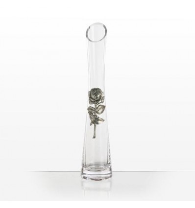 Семпла тясна издължена ваза с флорален дизайн - елегантно инкрустирана детайлна метална роза със стебло и листа, изработена от сплав от калай и сребро. Предлага в бяла картонена кутия. Произведена в Португалия от „Freitas & Dores“.