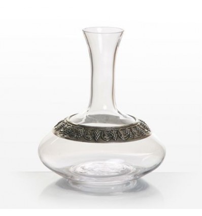 Декантер за вино от кристално стъкло с издължено гърло и широка, плоска основа, която способства по- бързото насищане с кислород на виното т.нар. аерацията на виното/ това е напитка, която „диша“. Кислородът омекотява и подобрява качествата на виното/. Стилна декорация от сплав от калай и сребро във формата на грозд с листа. Предлага в бяла картонена кутия. Произведена в Португалия от „Freitas & Dores“.