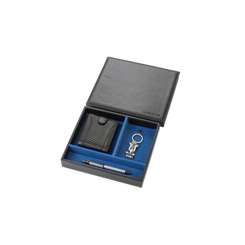 Луксозен комплект, който включва портфейл от естествена кожа, елегантна химикалка и клчодържател в подaръчна кутия на SILVER FLAME. Двойно тапициран монетник с кожа против износвне от монети. Размери на портфейла: 11 x 9 см.