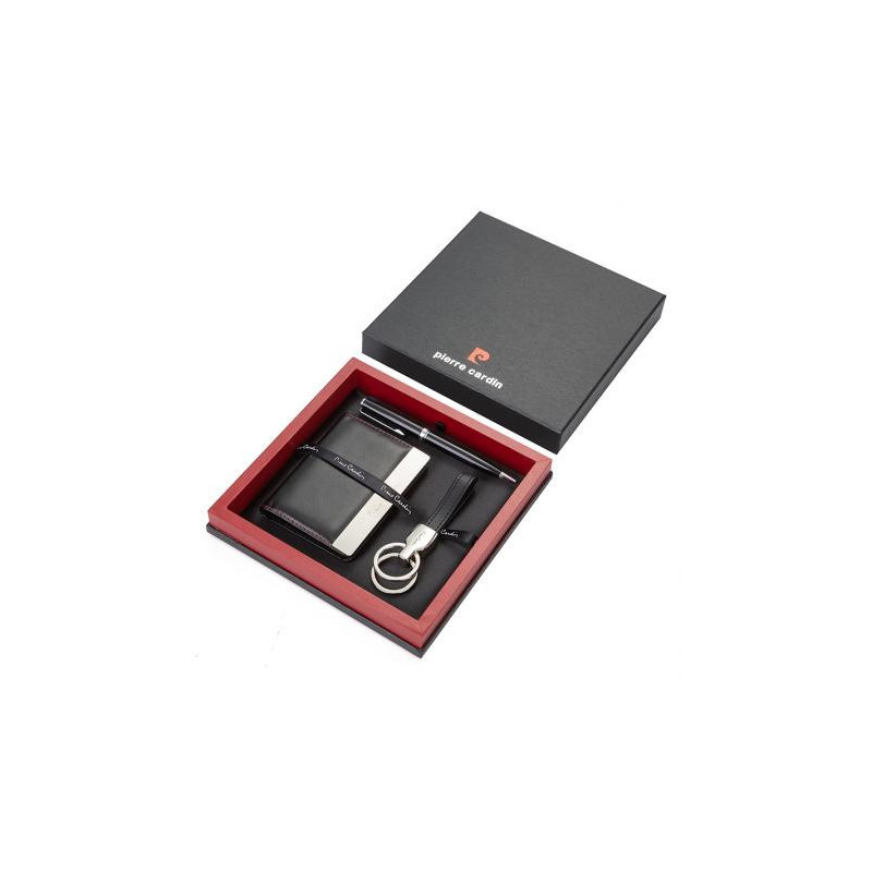 Луксозен комплект, който съдържа калъф за документи, ключодържател и химикал, съчетани със стилна кутия Pierre Cardin. Калъфът за документи е изработен от еко кожа. Размери на калъфа за дoкументи: 11 x 8 x 1 см. Размери на ключодържателя : 11.5 х 2.5 см