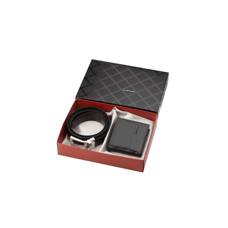Луксозен комплект, който включва портфейл от естествена кожа и двулицев колан в подaръчна кутия на SILVER FLAME. Размери на портфейла: 11.5 x 9.5 x 2 см.