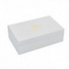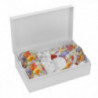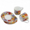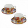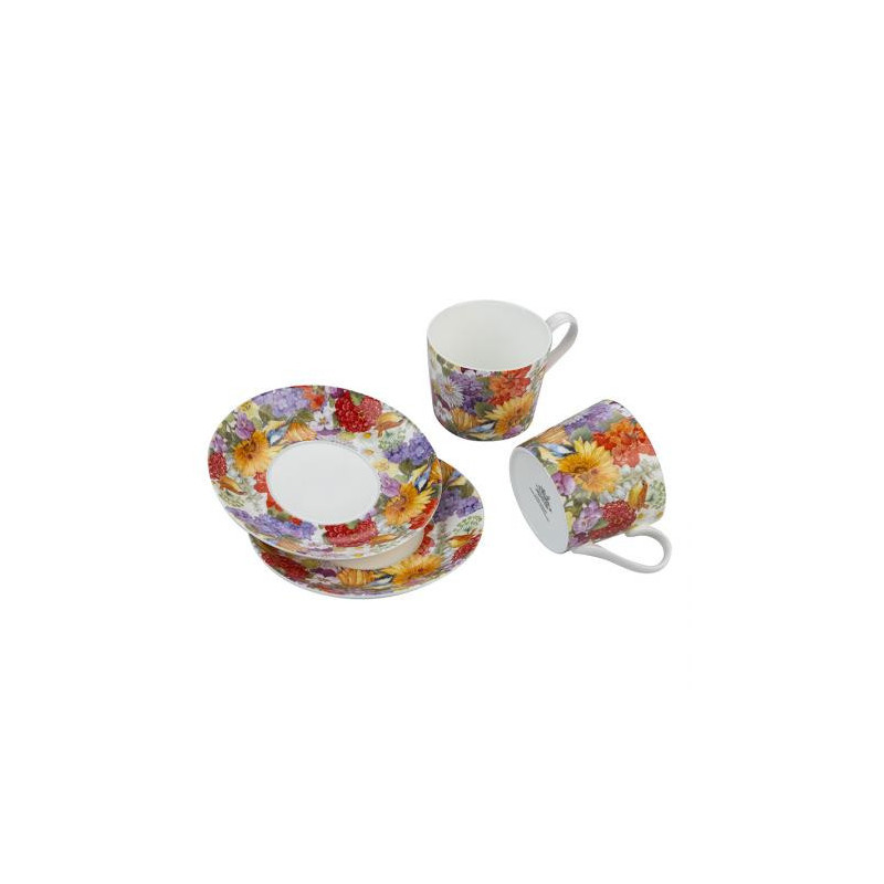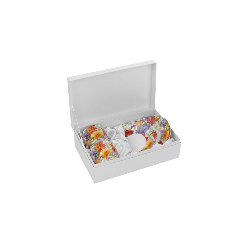 Комплекта се състои от два броя чаши и два броя чинийки изработени от супер фин костен порцелан. Размер на чашите : височина 7 см. ; Ø 9 см. ; вместимост 200 мл. Размер на чинийките: Ø 16 см. Предлага се в стилна подаръчна кутия.