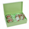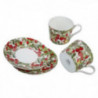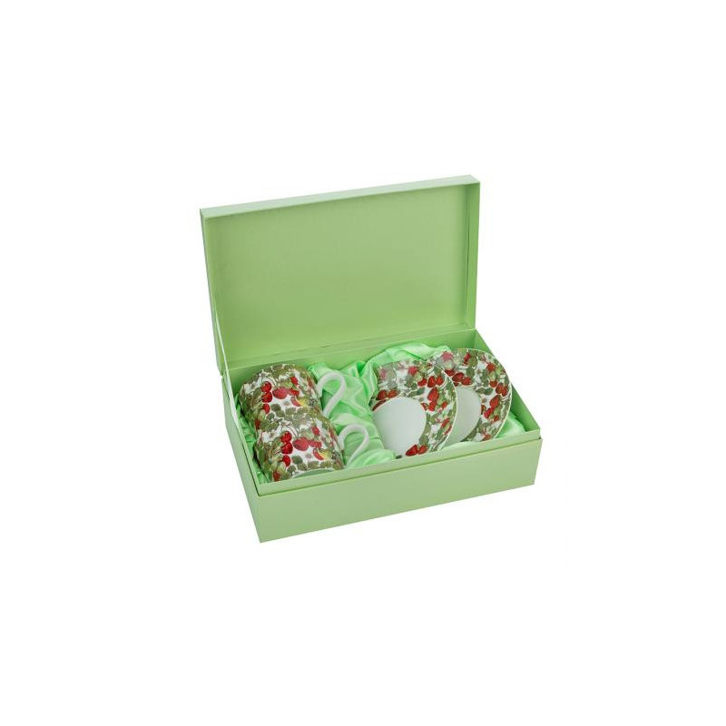 Комплекта се състои от два броя чаши и два броя чинийки изработени от супер фин костен порцелан. Размер на чашите : височина 7 см. ; Ø 9 см. ; вместимост 200 мл. Размер на чинийките: Ø 16 см. Предлага се в стилна подаръчна кутия.