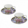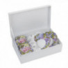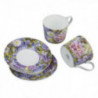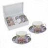 Комплекта се състои от два броя чаши и два броя чинийки изработени от супер фин костен порцелан. Размер на чашите : височина 7 см. ; Ø 9 см. ; вместимост 200 мл. Размер на чинийките: Ø 16 см. Предлага се в стилна подаръчна кутия.