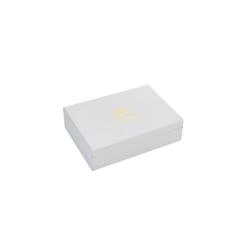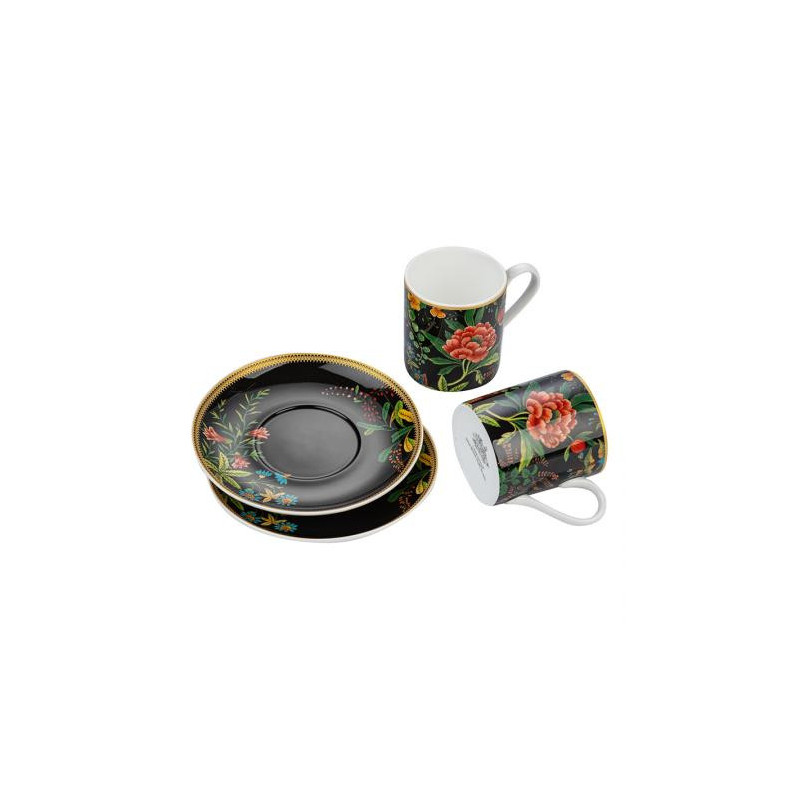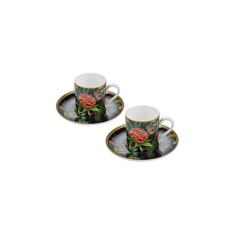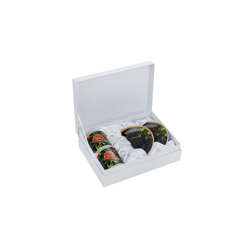 Комплекта се състои от два броя чаши и два броя чинийки изработени от супер фин костен порцелан. Размер на чашите : височина 6 см. ; Ø 5.5 см. ; вместимост 70 мл. Размер на чинийките: Ø 13 см. Предлага се в стилна подаръчна кутия.