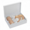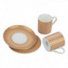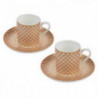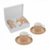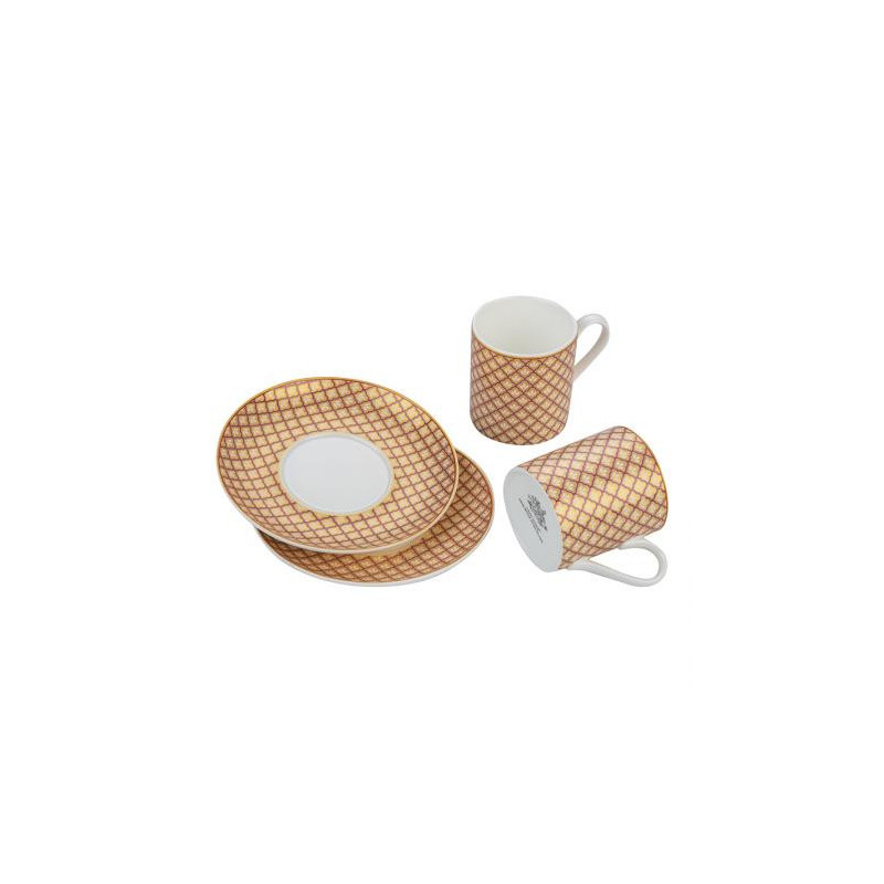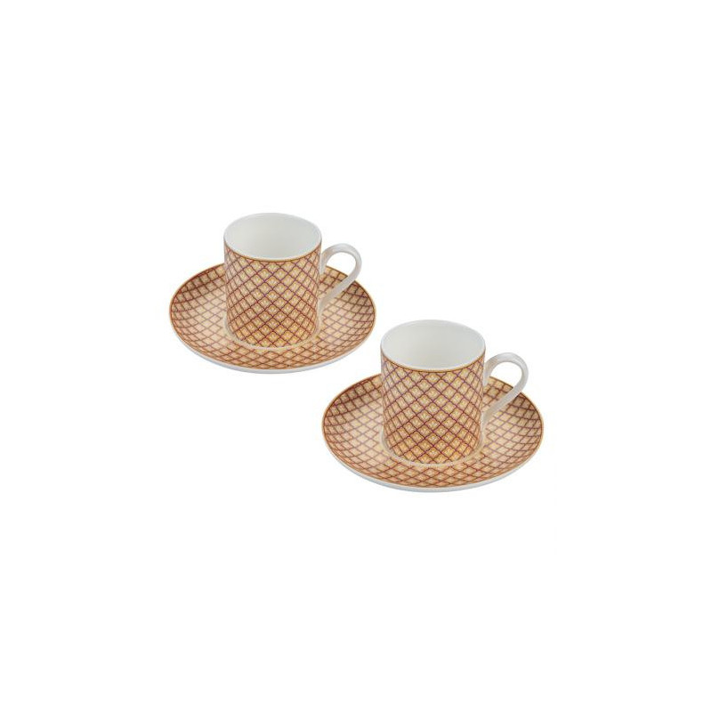 Комплекта се състои от два броя чаши и два броя чинийки изработени от супер фин костен порцелан. Размер на чашите : височина 6 см. ; Ø 5.5 см. ; вместимост 70 мл. Размер на чинийките: Ø 13 см. Предлага се в стилна подаръчна кутия.