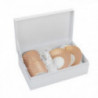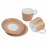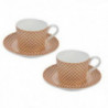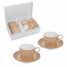 Комплекта се състои от два броя чаши и два броя чинийки изработени от супер фин костен порцелан. Размер на чашите : височина 7 см. ; Ø 9 см. ; вместимост 200 мл. Размер на чинийките: Ø 16 см. Предлага се в стилна подаръчна кутия.